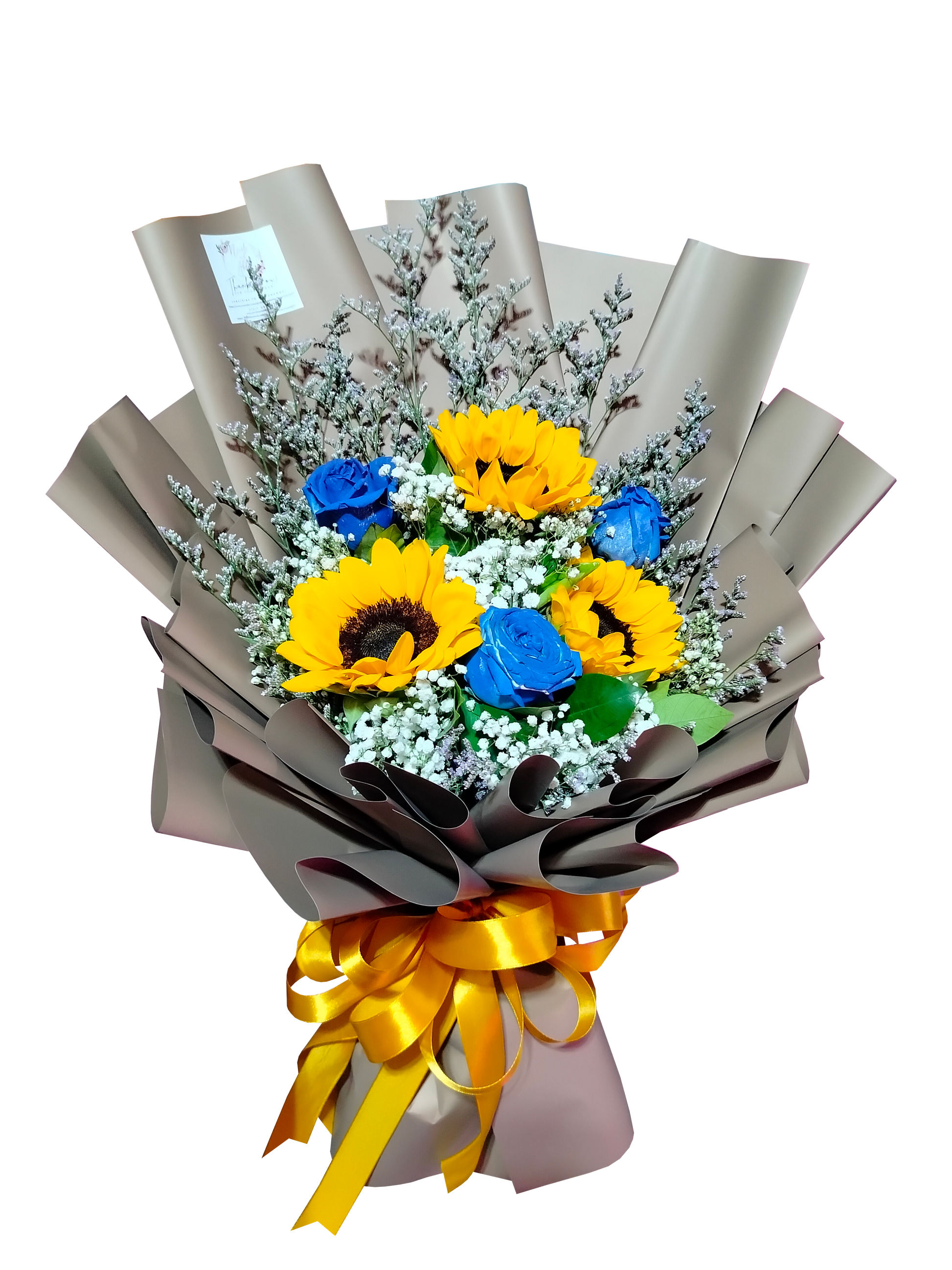 Overall, the bouquet is bold, unique, and elegant, blending the classic cheer of sunflowers with the unusual, eye-catching color of blue roses.
