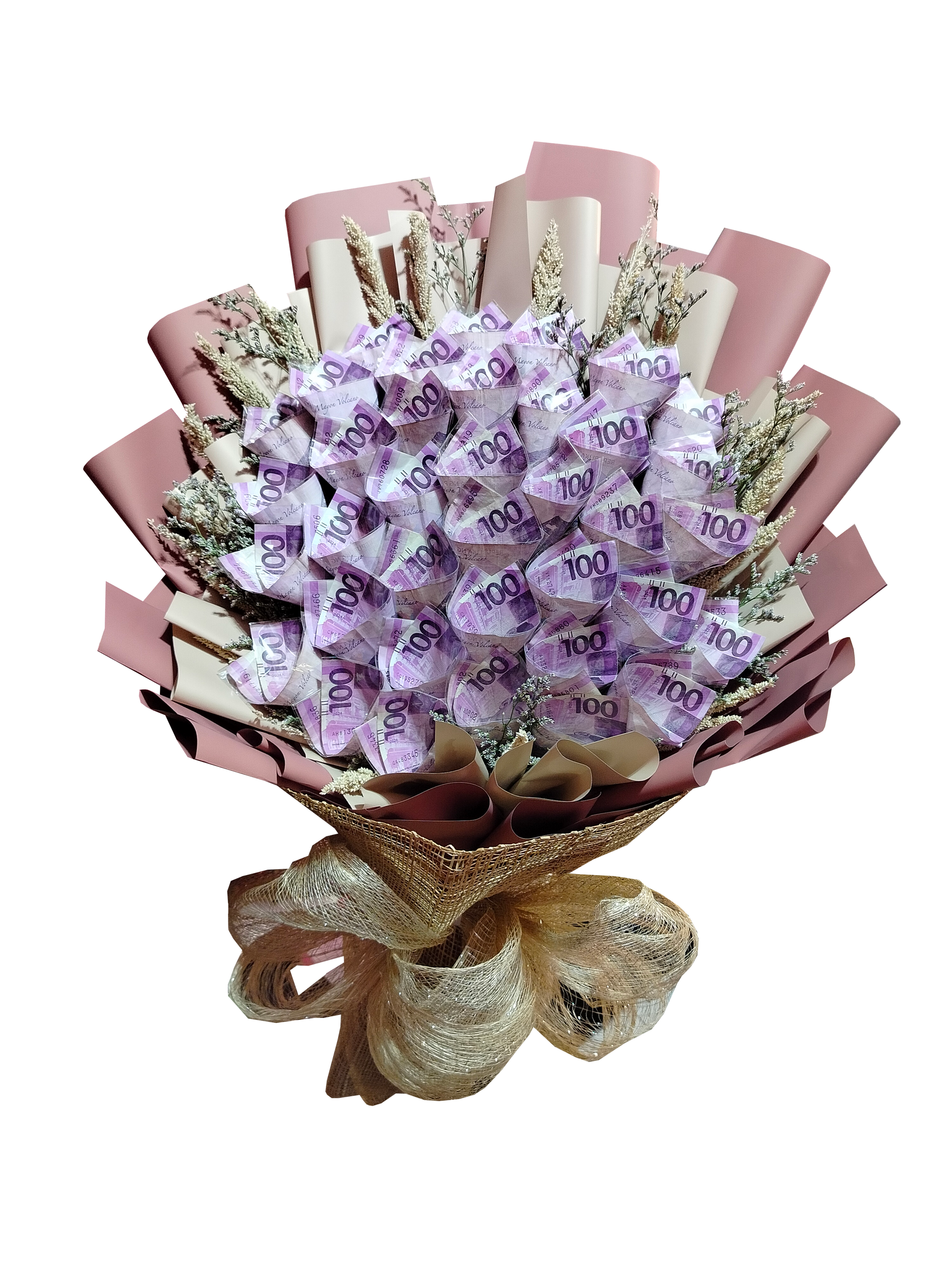 "Flowers": The main body of the bouquet is composed entirely of folded Philippine Peso bills. Based on the color and visible numbers, these are 100-Peso notes (PHP 100), which are predominantly purple. The bills are carefully folded into rose-like or petal shapes, creating a large, voluminous cluster that simulates a floral arrangement.